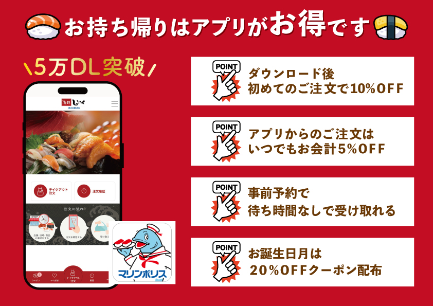 いつもマリンポリスグループをご利用いただき、ありがとうございます。 \新しくお持ち帰りポイントカードが登場!/ お持ち帰り限定で、お会計1000円毎に1ポイント [ … ]
