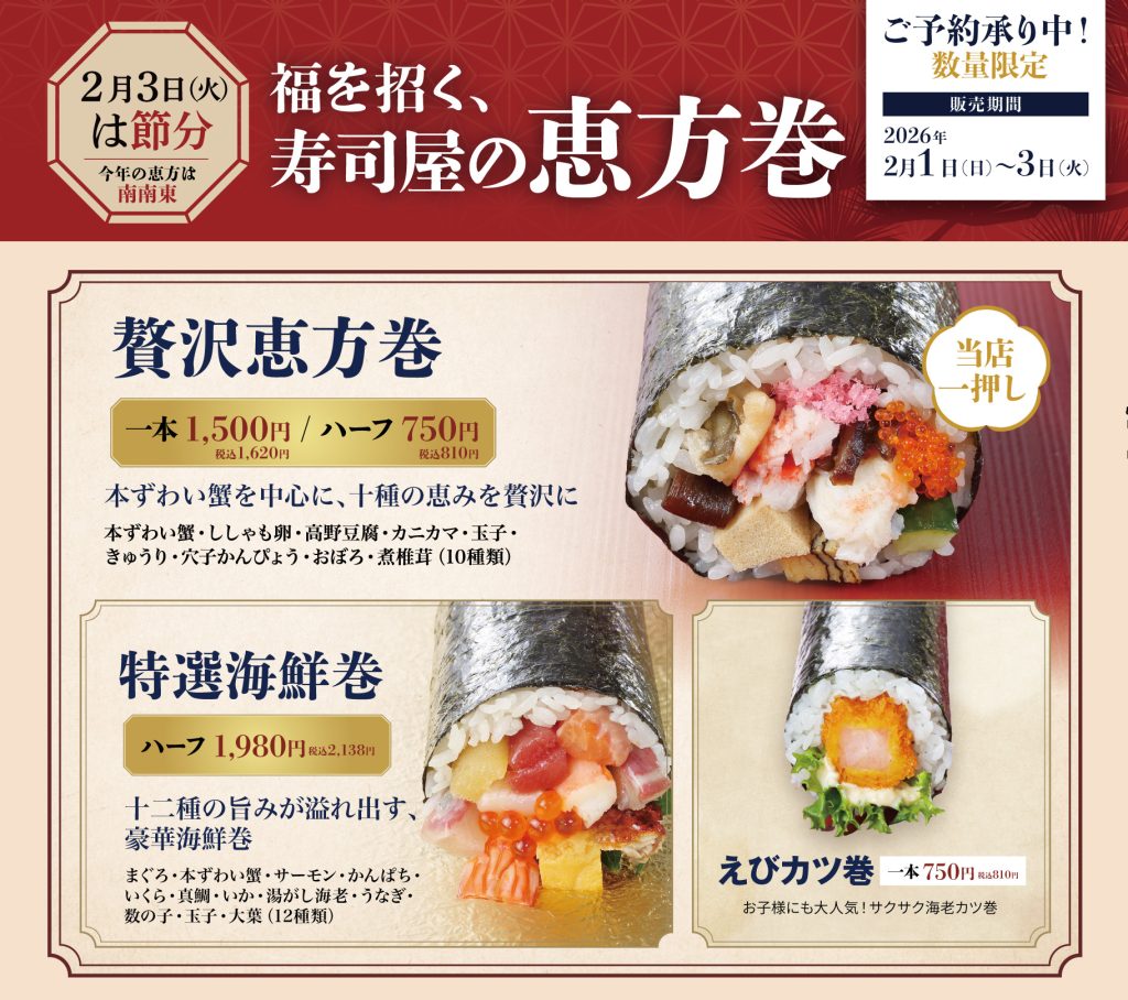 お名前必須 ふりがな必須 電話番号必須 携帯電話番号 メールアドレス必須 お持ち帰り店舗必須 海都 本店 海都 岡山駅前店 海都 平井店 海都 西大寺店 海都 東川原店 海都 大安寺店 しーじゃっく 竹屋町店 海都 出雲ドーム店 海都 大田店 しーじゃっく 三刀屋店 しーじゃっく 出雲駅南店 すし日和 イオン松江店 海都 一の宮店 海都 南岩国店 海都 イオンタウン小郡店 海都 苅田店 海都 徳力店 海都 直方店 しーじゃっく 武雄店 お持ち帰り日時必須 選択してください2月1日(日)2月2日(月)2月3日(火)111213141516171819 時 0030 分頃 お買い上げ本数必須 贅沢恵方巻(ハーフ) 本 / 1本 810円(税込)贅沢恵方巻(一本) 本 / 1本 1,620円(税込)特選海鮮巻(ハーフ) 本 / 1本 2,138円(税込)えびカツ巻 本 / 1本 810円(税込)合計金額0円(税込) ご入力いただいたお客さまの個人情報につきましては、お問い合わせ対応のために使用させていただきます。 その他、個人情報の取り扱いに関しましては、個人情報保護についてをご覧ください。